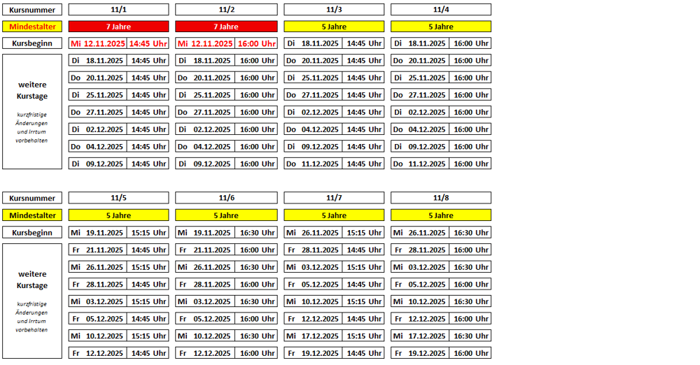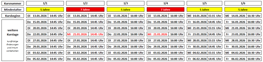 - Angemeldete Kinder die jünger sind können an dem Kurs nicht teilnehmen. Eine Rückerstattung von Anmeldegebühr/Kursgebühr ist ausgeschlossen.